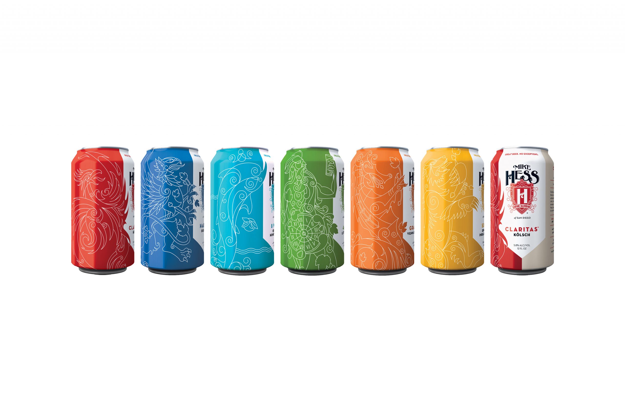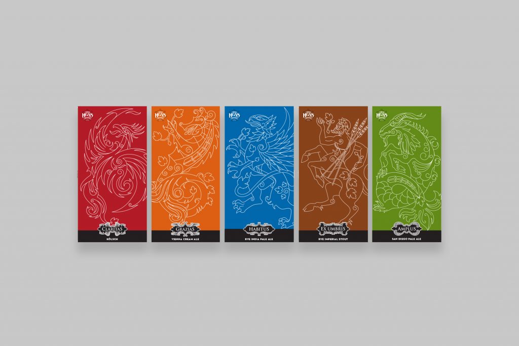 Solution: We created a brand centered around a coat of arms design, featuring a unique mythological creature for each beer. The shield logo served as the focal point, with creatures flanking it, and each beer brand represented by specific colors and a Latin-inspired name such as “Claritas” (clarity). The name “Mike Hess” was consistently in black, with the coat of arms reflecting each beer’s unique hue.